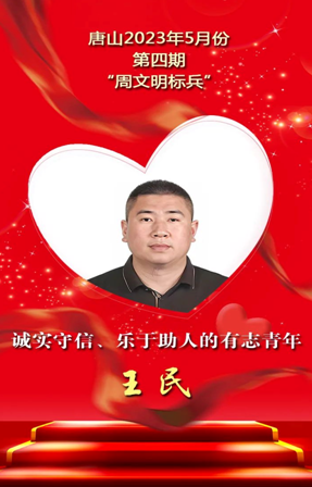 日前,唐山市“文明標(biāo)兵”評(píng)選發(fā)布組委會(huì)辦公室公布了2023年5月份第四期“周文明標(biāo)兵”名單。他們是: